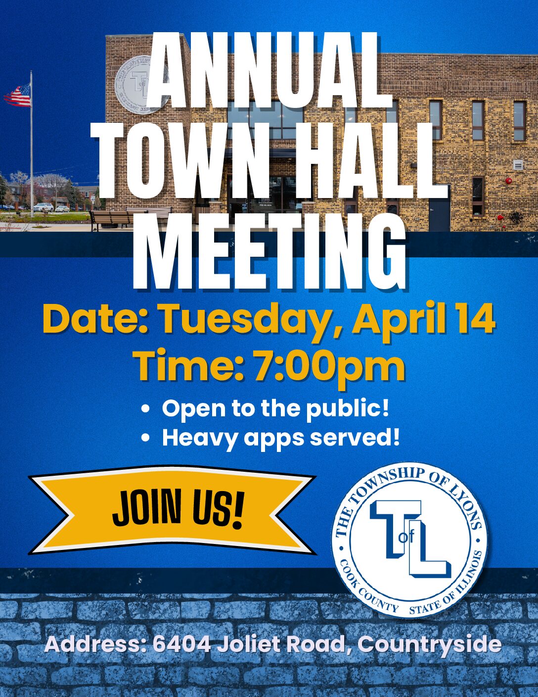 Annual Town Hall Meeting Date April 14, 2026 Time 7:00 pm This event is open to the public and will offer heavy appetizers!