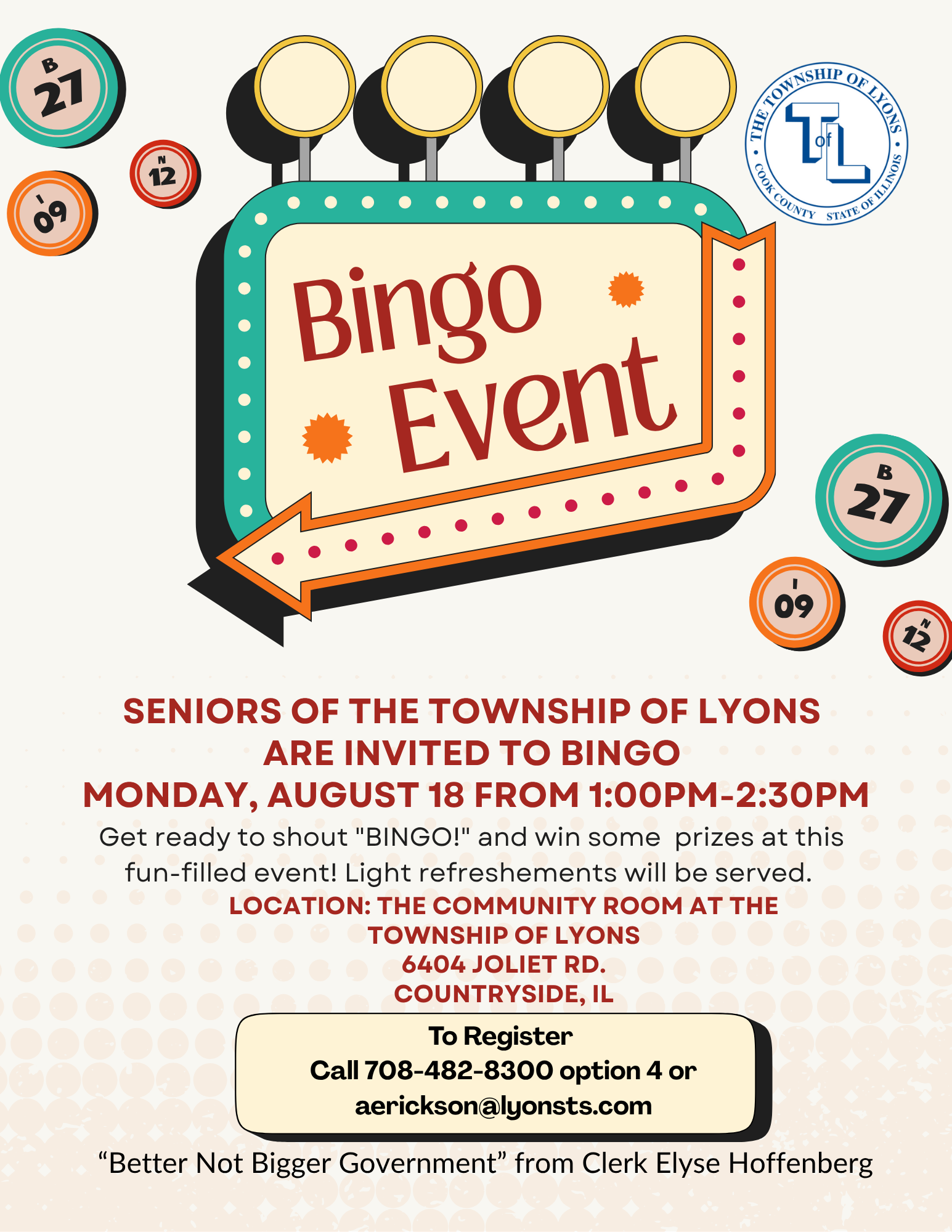 Join us for a fun, relaxing afternoon of BINGO. Refreshments will be served. RSVP 708.482.8300 option 4, or aerickson@lyonsts.com