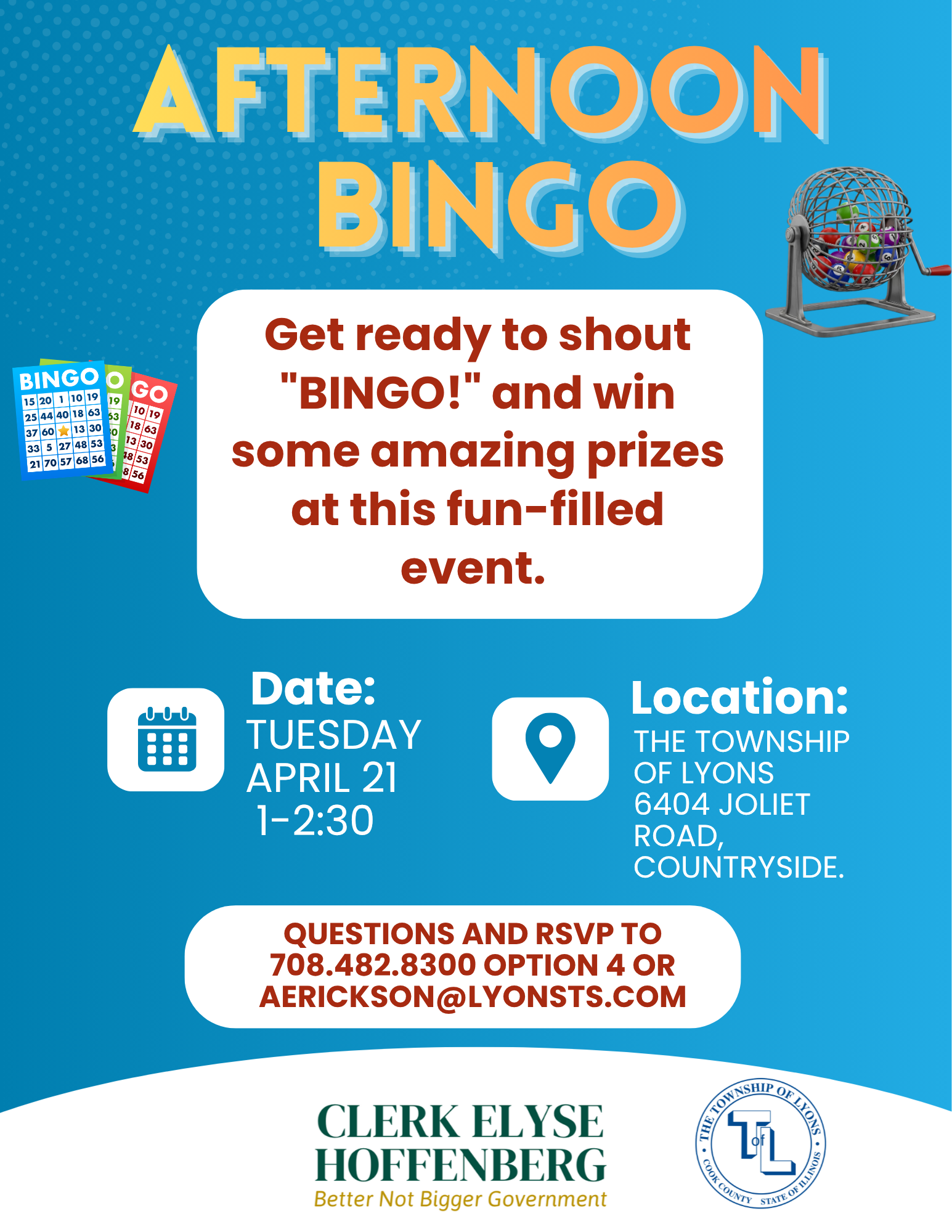 Come for a fun, relaxing afternoon of BINGO. Tuesday April 21 from 1-2:30. To RSVP call 708.482.8300 option 4 or email aerickson@lyonsts.com