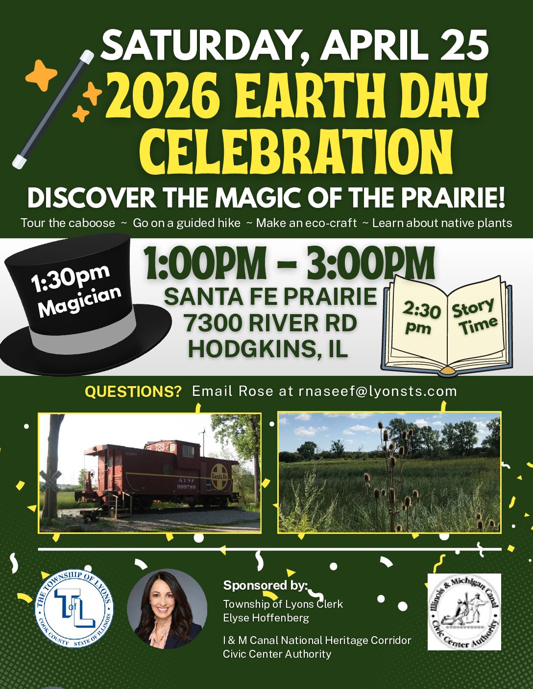 Earth Day Celebration 2026 Date April 25, 2026 Time 1:00 pm Discover the Magic of the Santa Fe Prairie! 1:30pm Magician 2:30pm Story Time Address Santa Fe Prairie 7300 RIVER RD, Hodgkins, IL Open in Google Maps