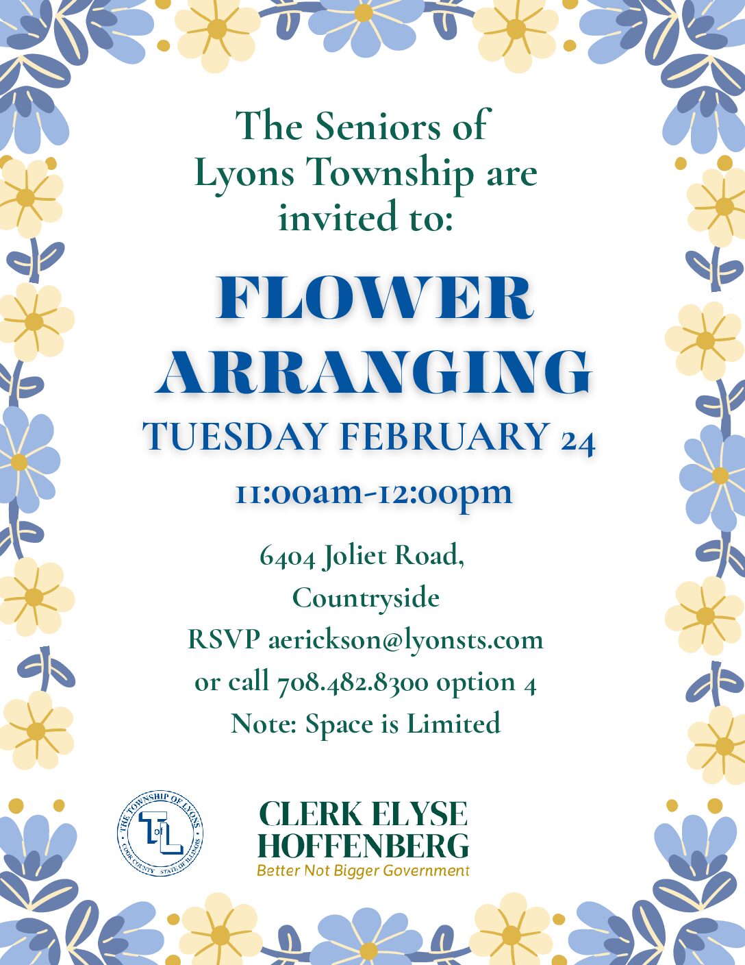 Flower Arranging Feb 24 2026 Date February 24, 2026 Time 11:00 am - 12:00 pm The Seniors of the Township of Lyons are invited to: Flower Arranging Tuesday, February 24 from 11:00am-12:00pm in the Township of Lyons Community Room