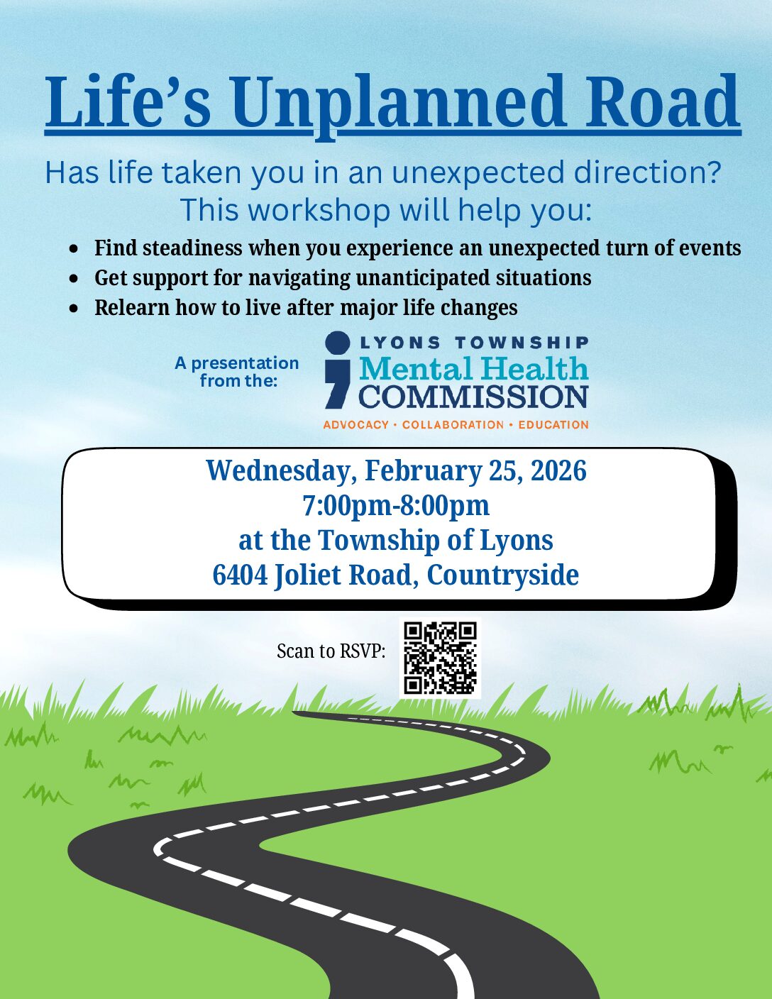 Life’s Unplanned Road Feb 25 2026 Date February 25, 2026 Time 7:00 pm - 8:00 pm RSVP HERE Life’s Unplanned Road Presentation on Wednesday, February 25, 2026 Time: 7pm-8pm Has life taken you in an unexpected direction? This workshop is for you.