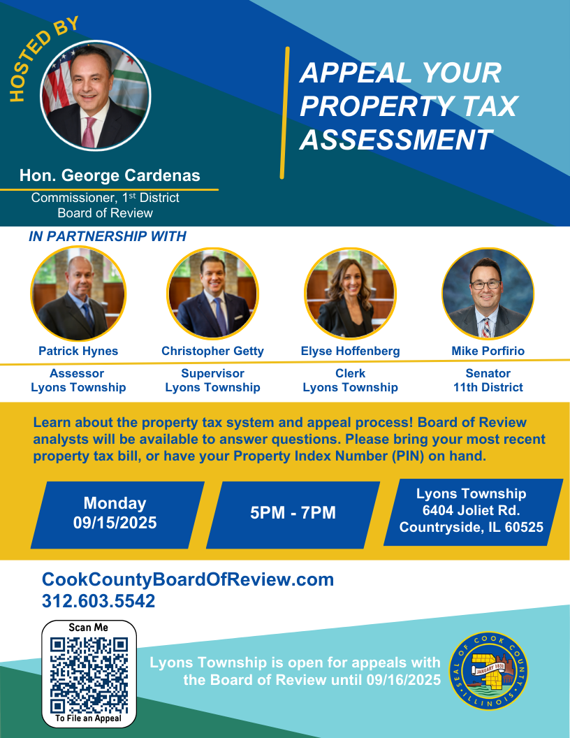 Learn about the property tax system and appeal process! Board of Review analysts will be available to answer questions. Please bring your most recent property tax bill, or have your Property Index Number (PIN) on hand.