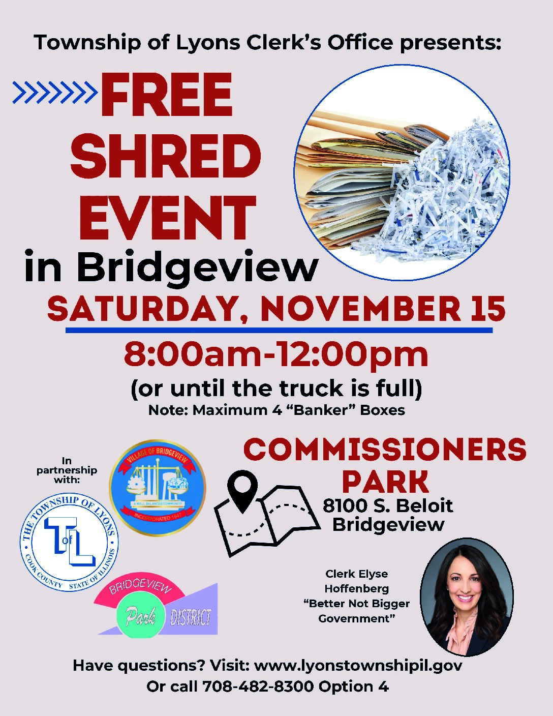 Shred Event Bridgeview 2025 Date November 15, 2025 Time 8:00 am - 12:00 pm Free Shred Event in Bridgeview at Commissioners Park: 8100 S Beloit, Bridgeview 8:00am – Noon or until the Truck is Full Note: Maximum of 4 “Banker Boxes” Address Bridgeview Park District 8100 S Beloit, Bridgeview, IL 60455 Open in Google Maps