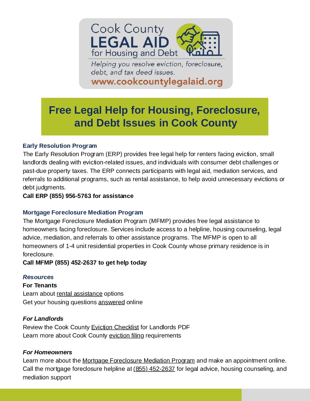 Cook County Legal Aid for Housing and Debt (CCLAHD) provides free legal assistance to Cook County residents facing issues like eviction, foreclosure, consumer debt, and property tax problems. It connects people with legal help, mediation services, and other resources, such as rental assistance, to help resolve these challenges. Click HERE to download the clickable PDF.